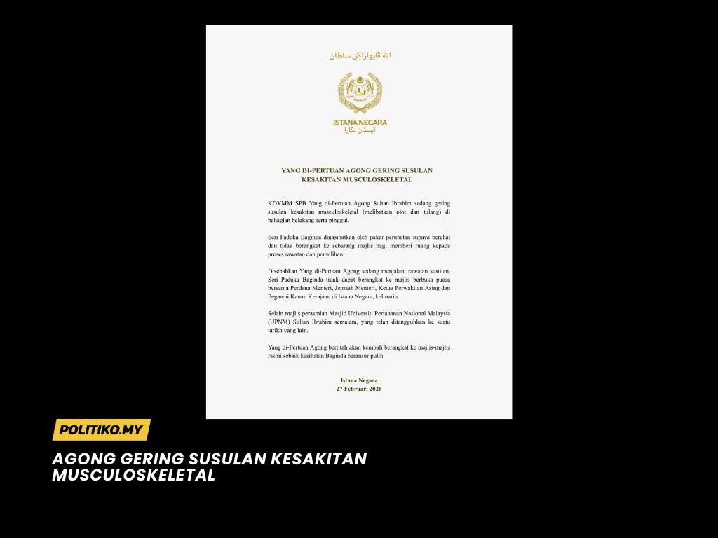 KUALA LUMPUR | 27 Feb 26 — Istana Negara memaklumkan bahawa Kebawah Duli Yang Maha Mulia Seri Paduka Baginda Yang di-Pertuan Agong, Sultan Ibrahim, kini gering susulan kesakitan musculoskeletal melibatkan otot dan tulang di bahagian belakang serta pinggul.