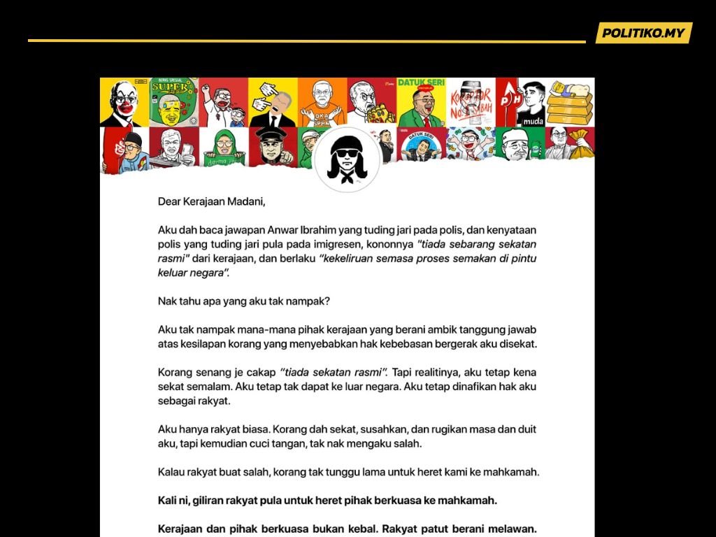 “Korang senang je cakap ‘tiada sekatan rasmi’, tapi realitinya, aku tetap kena sekat semalam. Aku tetap tak dapat ke luar negara. Aku tetap dinafikan hak aku sebagai rakyat.