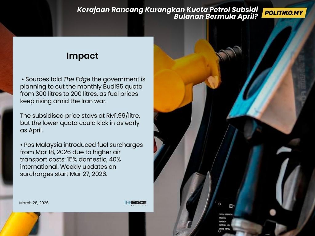 KUALA LUMPUR | 26 Mac 26 – Kerajaan dilapor sedang merangka untuk mengurangkan had bulanan kelayakan petrol RON95 bersubsidi di bawah program Budi95, daripada 300 liter kepada hanya 200 liter sebulan, berkuat kuasa mulai April ini, menurut sumber media The Edge.