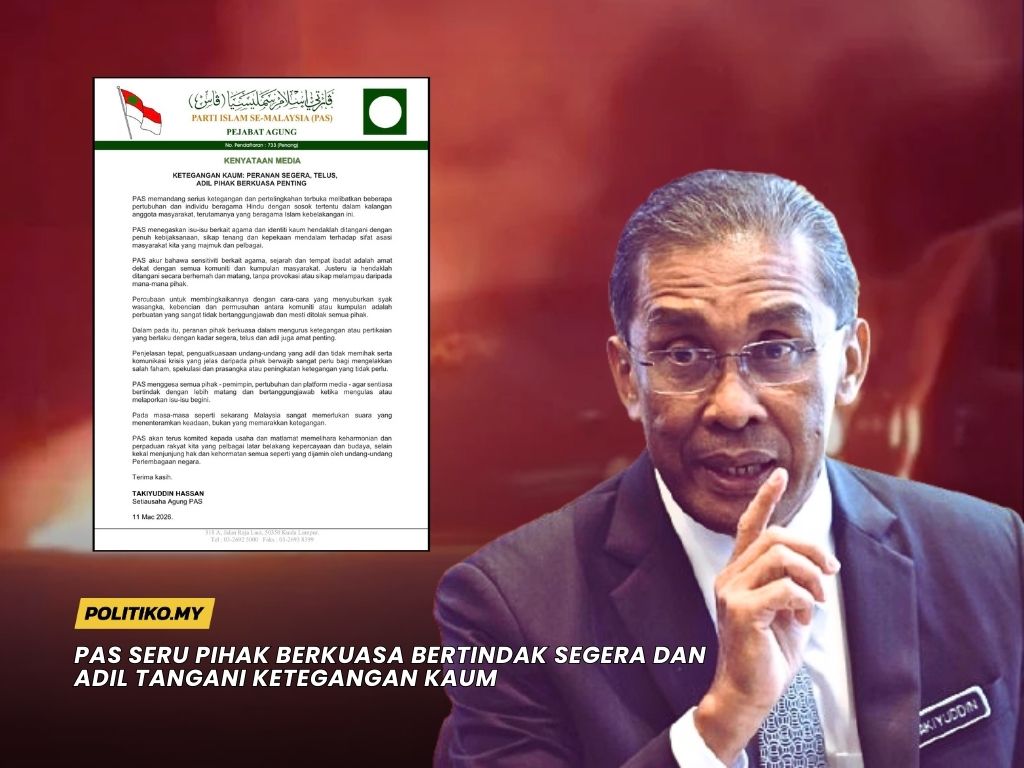 KUALA LUMPUR | 11 Mac 26 – Parti Islam Se-Malaysia (PAS) menegaskan kepentingan tindakan segera, telus, dan adil oleh pihak berkuasa bagi menangani ketegangan dan pertelingkahan yang melibatkan beberapa pertubuhan dan individu beragama Hindu dengan sosok tertentu dalam kalangan masyarakat Islam kebelakangan ini.