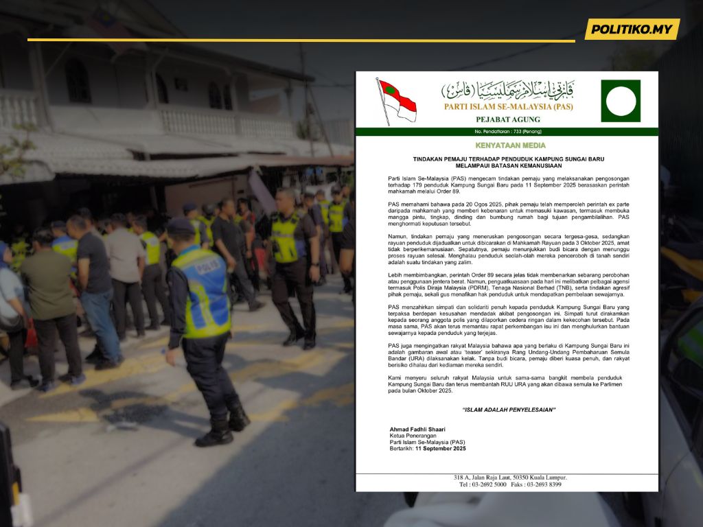 KUALA LUMPUR, 11 Sep 25 – Parti Islam Se-Malaysia (PAS) mengecam keras tindakan pemaju yang melaksanakan pengosongan terhadap 179 kediaman di Kampung Sungai Baru hari ini, sambil menyifatkannya sebagai tindakan zalim kerana rayuan penduduk masih belum selesai di Mahkamah Rayuan.