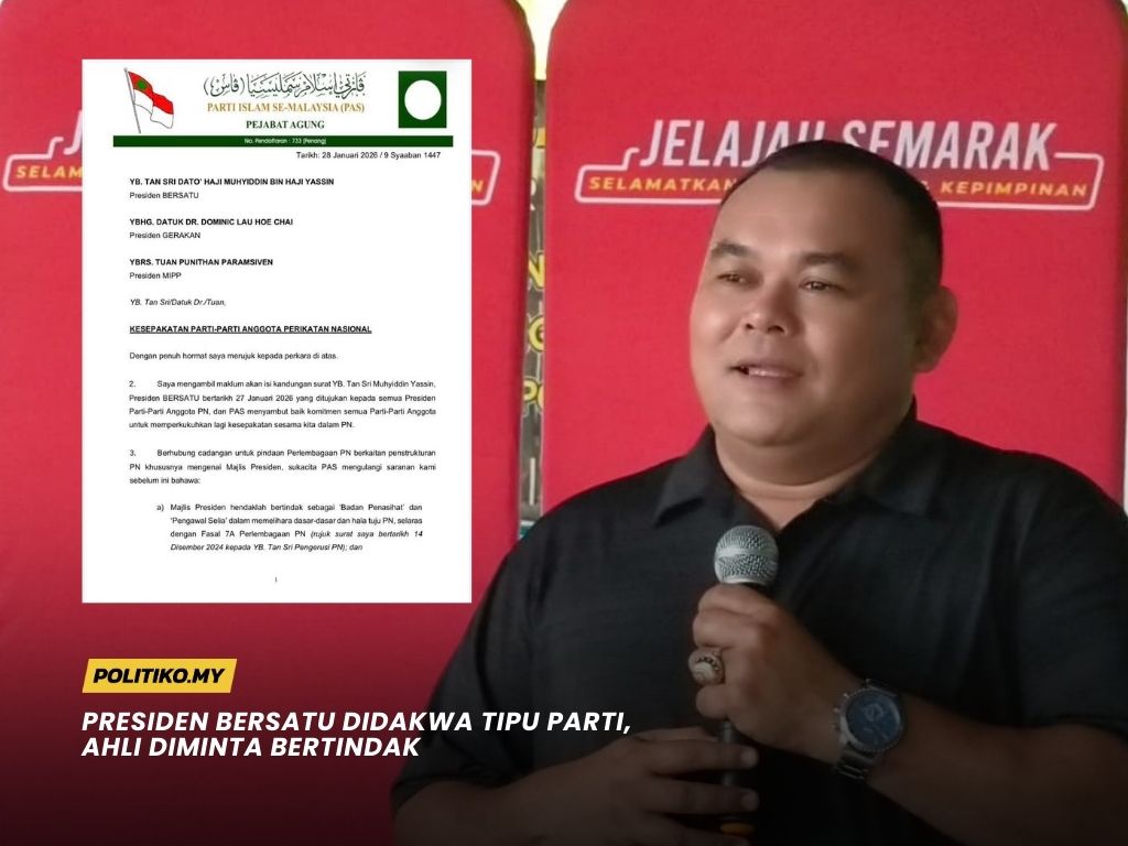 PENGERANG | 29 Jan 26 — Bekas Ketua Bahagian BERSATU Pengerang, Mohd Faizal Asmar, mendakwa Presiden BERSATU, Muhyiddin Yassin, berbohong secara terbuka berhubung dakwaan kononnya PAS dan BERSATU telah bersetuju memansuhkan jawatan Pengerusi Perikatan Nasional (PN).