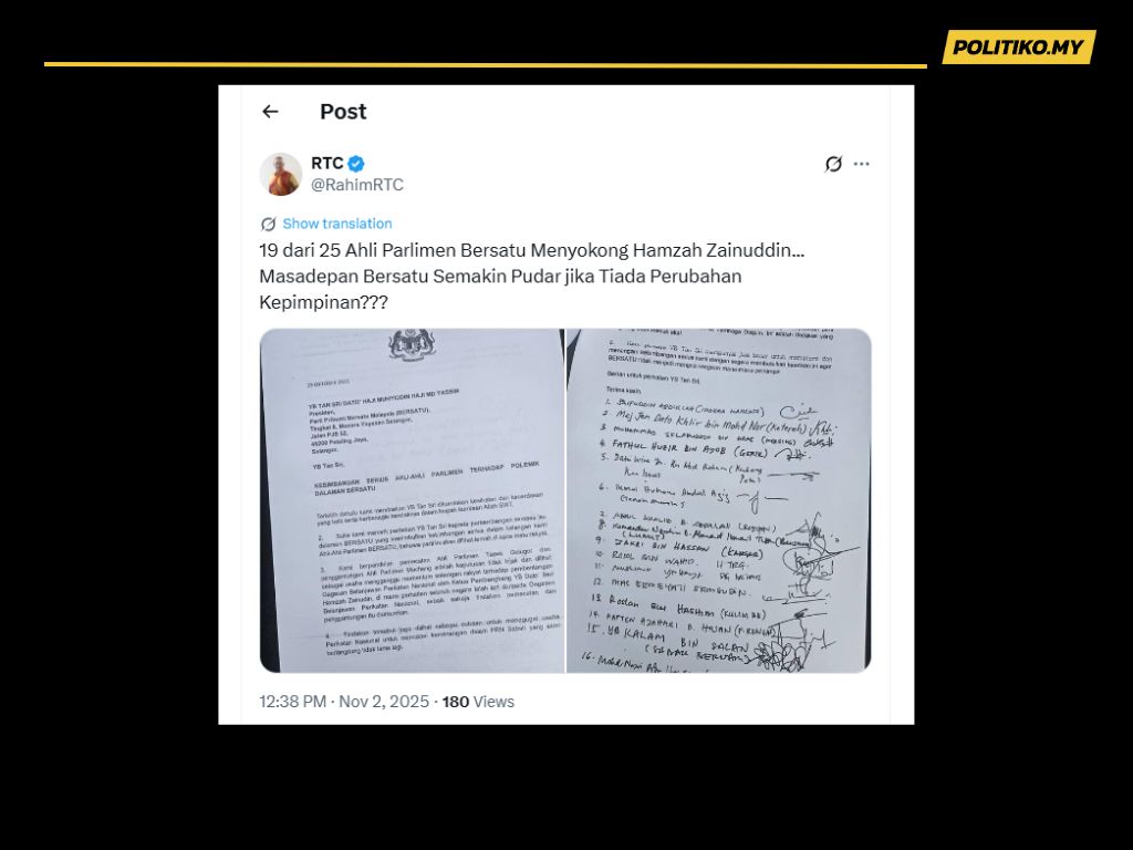 “(Seramai) 19 dari 25 Ahli Parlimen Bersatu menyokong Hamzah Zainuddin… Masa depan Bersatu semakin pudar jika tiada perubahan kepimpinan?,” katanya.
