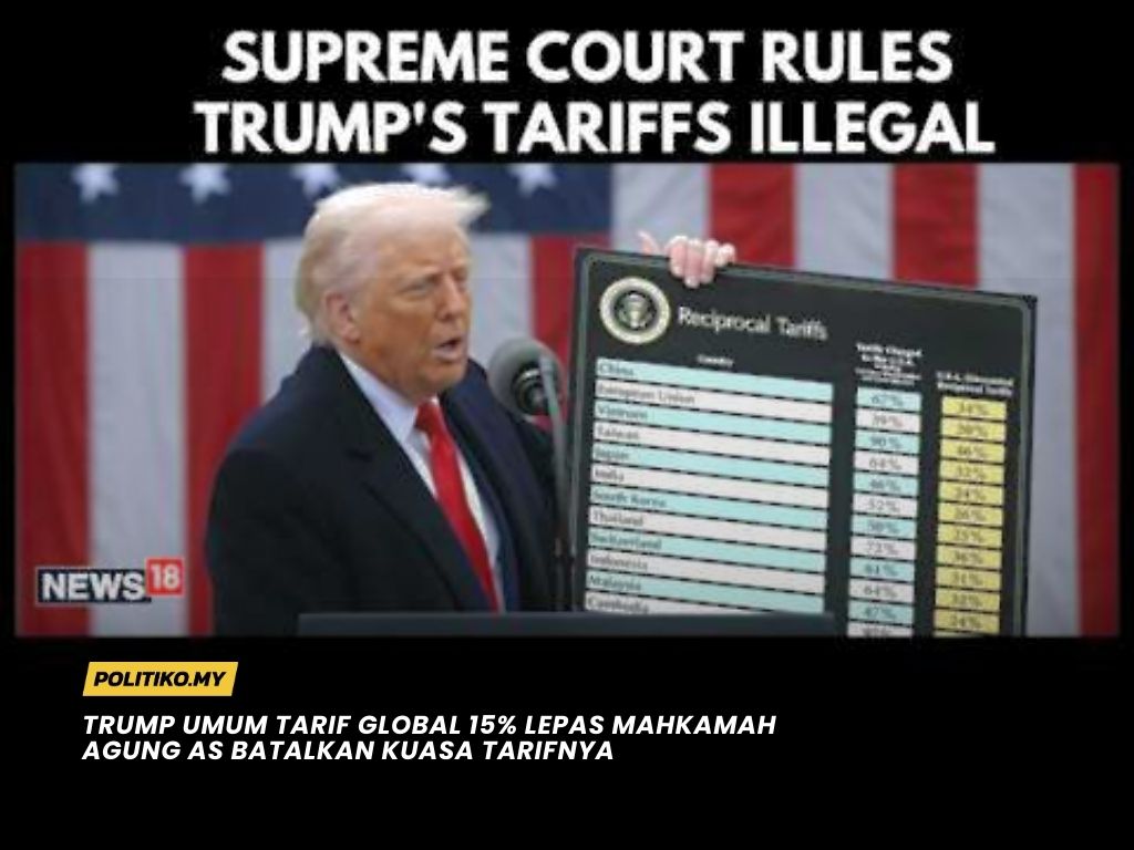 KUALA LUMPUR | 22 Feb 26 – Presiden Amerika Syarikat, Donald Trump mengumumkan peningkatan kadar tarif import global kepada 15 peratus, sebagai tindak balas kepada keputusan Mahkamah Agung AS yang membatalkan sebahagian besar kuasa tariff yang sebelum ini dimilikinya.